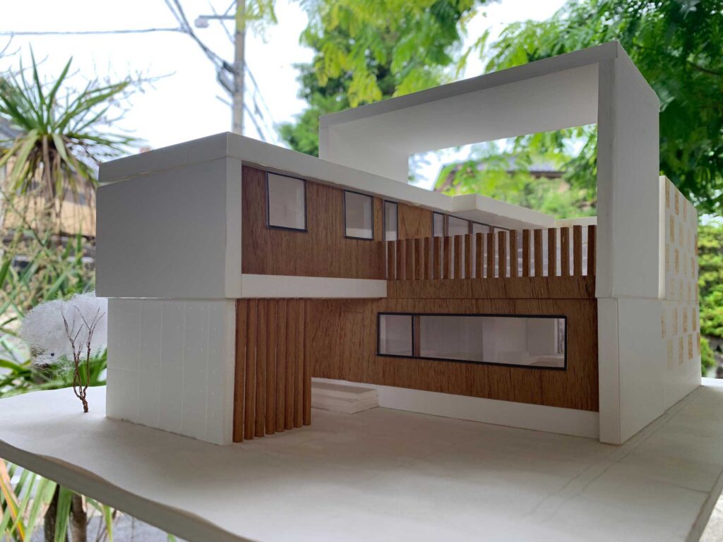 場所は北・西道路の角地で周辺は閑静な住宅街になります。こちらに木造2階建てのアトリエ併設住宅を建てました。